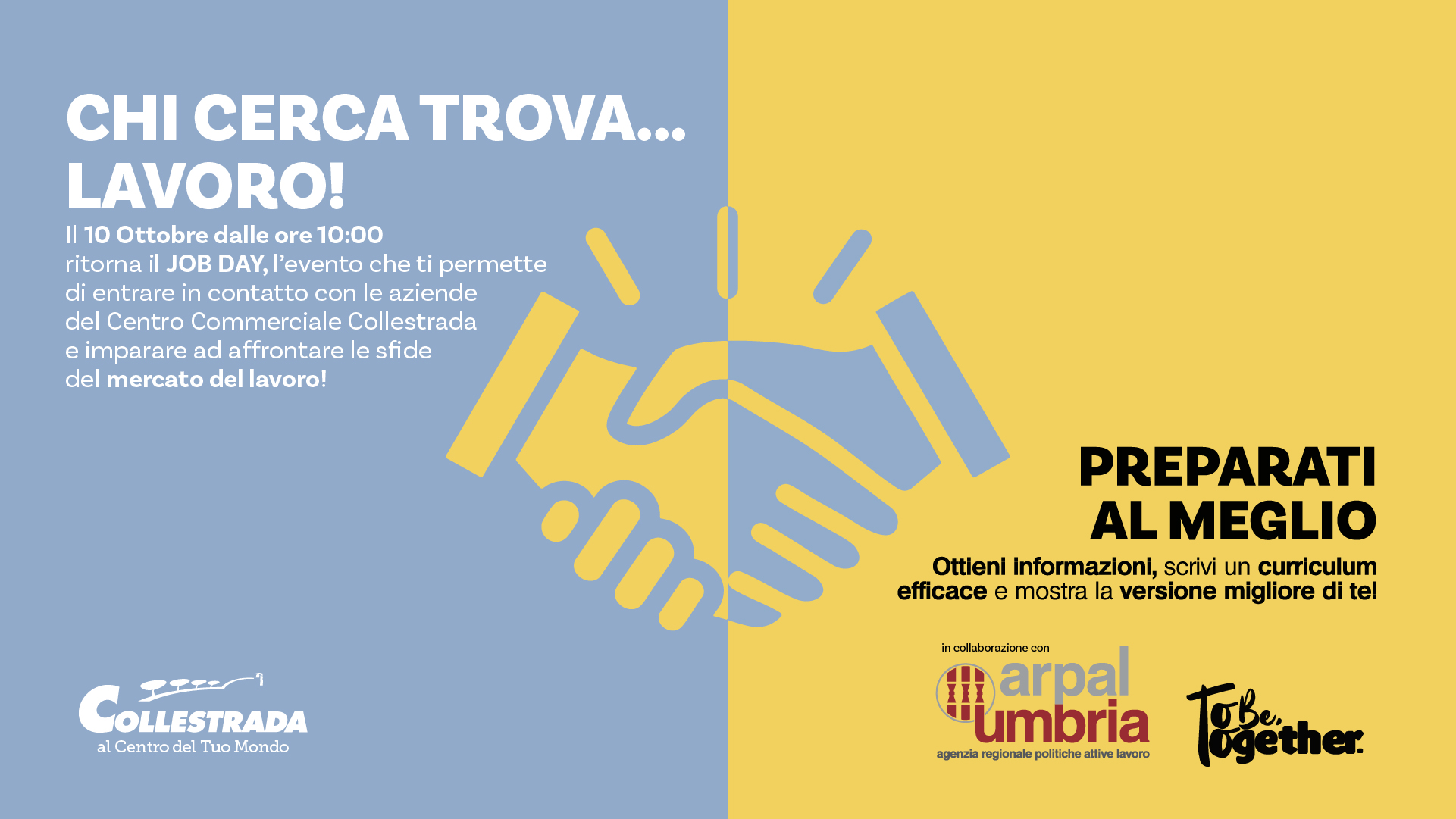 Il Centro Commerciale Collestrada ti aspetta venerdì 10 ottobre dalle 10:00 per il Job Day: una giornata dedicata all’incontro tra candidati e aziende.