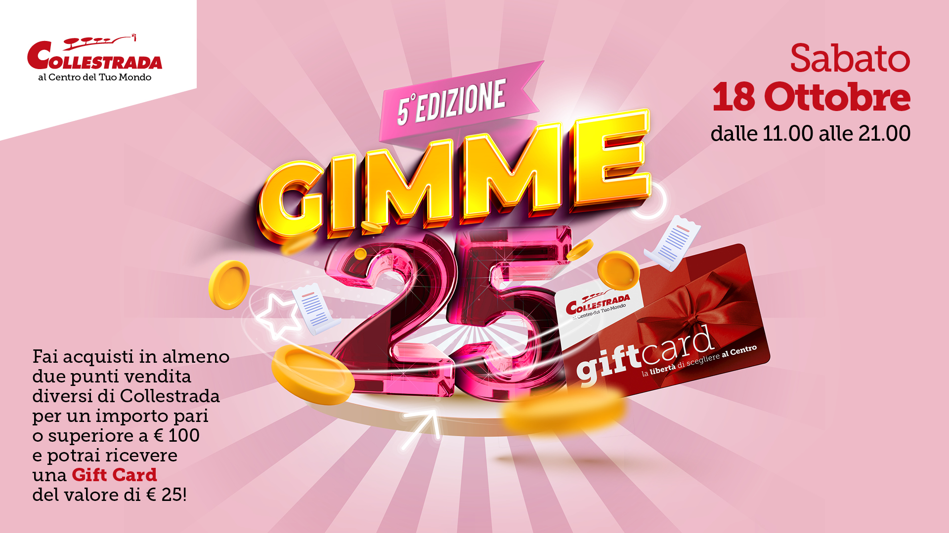 Fai shopping in almeno due negozi diversi del Centro per un totale minimo di 100€, porta gli scontrini al desk promozionale e riceverai subito una Gift Card da 25€!